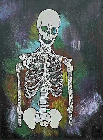 The skeleton is in outer space in the cosmos, he has cool tattoos and is just chillin.
